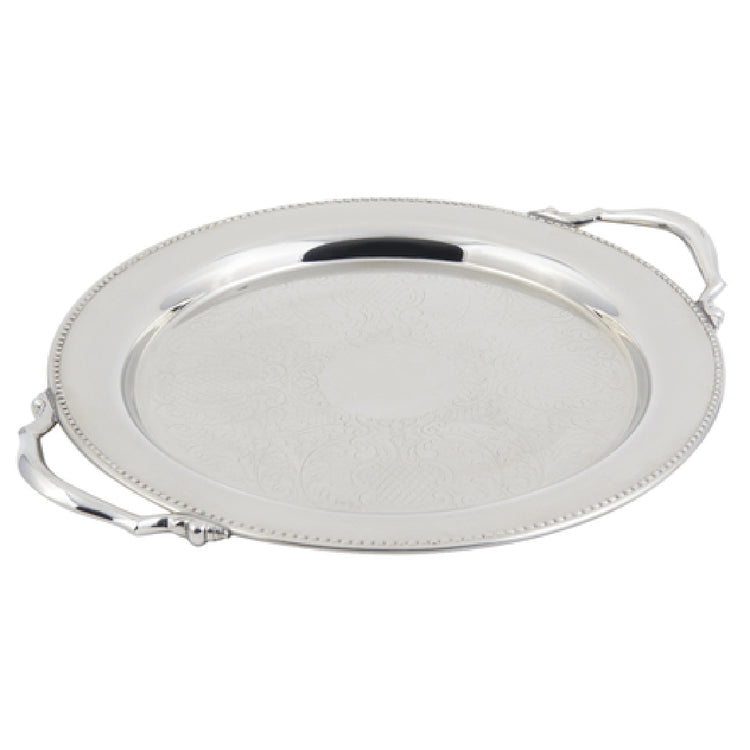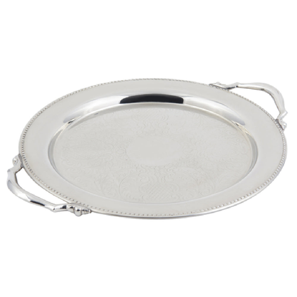 The Bon Chef 61334 Tray - 13" Diameter Round is a versatile and elegantly designed serving tray that stands out with its practical and aesthetic features. This tray is crafted with a 13-inch diameter, making it an ideal size for a variety of serving needs in both residential and commercial settings. It is constructed from high-quality stainless steel, ensuring durability and a long-lasting polished finish that resists tarnishing and corrosion. The tray is designed with a handle, offering convenient handling and transportation, a significant advantage for hospitality professionals who require efficient service ware. Additionally, the tray features intricate etching, which adds an element of sophistication and detail, and a bead border that enhances its visual appeal, making it suitable for upscale dining environments and events. The Bon Chef 61334 Tray is perfect for caterers, restaurants, and home entertainers seeking a reliable and stylish serving solution. Its combination of functional design elements and quality craftsmanship makes it a valuable addition to any setting requiring a blend of utility and aesthetic charm.
