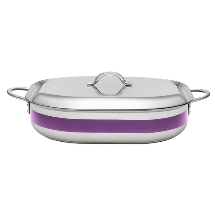 The Bon Chef 71004-CF2-P Country French X Oven Dish is a versatile kitchen essential with a capacity of 7 quarts, making it suitable for a variety of cooking applications. This oblong dish measures 15 inches in length, 11 inches in width, and 4 inches in height, providing ample space for preparing and serving meals. Crafted with an induction bottom, it is compatible with induction cooktops, enhancing its utility in modern kitchens. Constructed from durable stainless steel, this oven dish ensures longevity while maintaining a sleek appearance. The inclusion of a lid allows for efficient cooking and storage, retaining heat and moisture effectively. Its striking purple color adds a touch of elegance and style to any culinary setting, catering to both form and function. This oven dish is designed to meet the demands of professional chefs as well as home cooks, offering a reliable solution for diverse cooking needs. Whether used in a bustling restaurant kitchen or a cozy home environment, the Bon Chef 71004-CF2-P Country French X Oven Dish stands out with its robust construction and thoughtful design, providing a valuable addition to any kitchenware collection.