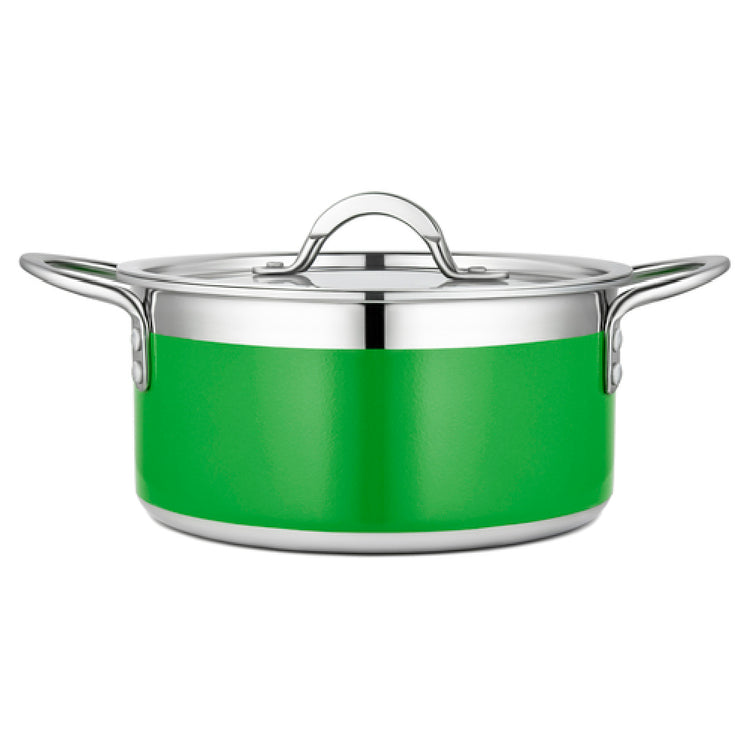 The Bon Chef 71301-CF2-L Country French X Pot 3 qt. 9 oz. is a meticulously crafted kitchen essential, measuring 8-5/8" in diameter and 3-7/8" in height. This round pot, complete with a functional lid, is designed with an induction bottom, optimizing it for modern cooking technology and ensuring efficient heat distribution. Constructed from high-quality stainless steel, this pot not only guarantees durability but also offers a sleek, polished appearance that complements any kitchen aesthetic. The vibrant lime color adds a touch of elegance and uniqueness, making it a standout piece in both professional and home kitchens. Its 3-quart and 9-ounce capacity makes it ideal for preparing a variety of dishes, catering to different market segments such as home cooks, culinary professionals, and restaurant operators. The Bon Chef Country French X Pot combines style with functionality, providing an exceptional cooking experience. Its robust construction is suited for the demands of high-performance kitchens, while its striking design appeals to culinary enthusiasts seeking quality and visual appeal. This pot exemplifies the perfect blend of traditional craftsmanship and contemporary design, making it a versatile addition to any culinary toolkit.