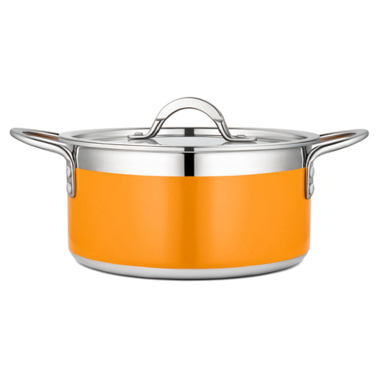 The Bon Chef 71301-CF2-O Country French X Pot is a versatile culinary tool designed to meet the demands of both professional kitchens and home cooking enthusiasts. This round pot boasts a capacity of 3 qt. 9 oz., providing ample space for preparing a variety of dishes. With dimensions of 8-5/8" in diameter and 3-7/8" in height, it balances size and functionality, making it suitable for multiple cooking tasks. The pot is equipped with an induction bottom, enhancing its compatibility with modern cooking technologies and ensuring efficient heat distribution across its stainless steel construction. The vibrant orange finish not only adds a splash of color to any cookware collection but also signifies its country-style aesthetic, appealing to those who appreciate both form and function. The inclusion of a lid aids in moisture retention and temperature control, essential for achieving the perfect simmer or slow-cook. This pot is ideal for industry segments ranging from high-end restaurants seeking reliable cookware to home chefs desiring professional-grade utensils in their kitchen. The Bon Chef 71301-CF2-O Country French X Pot embodies quality, durability, and style, making it a valuable addition to any culinary setting.