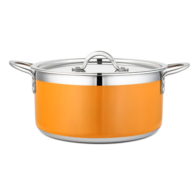 The Bon Chef 71303-CF2-O Country French X Pot is a meticulously crafted cookware piece ideal for both commercial kitchens and home chefs who value precision and quality in their culinary tools. With a capacity of 5 quarts and 22 ounces, this pot is well-suited for preparing a variety of dishes, from hearty stews to delicate sauces, making it versatile for diverse cooking needs. Its round shape, with dimensions of 10-1/8 inches in diameter and 4-3/4 inches in height, provides ample space for even heat distribution, essential for perfect cooking results. This pot comes with a lid, ensuring moisture retention and flavor enhancement during the cooking process. Notably, it features an induction bottom, making it compatible with induction cooktops, in addition to traditional heat sources, thus offering flexibility in the kitchen setup. Constructed from stainless steel, this pot promises durability and resistance to corrosion, while its vibrant orange exterior adds a touch of aesthetic appeal. The Bon Chef 71303-CF2-O Country French X Pot combines functional design with modern technology, making it a practical choice for professional chefs and cooking enthusiasts alike who require reliable and efficient cookware.