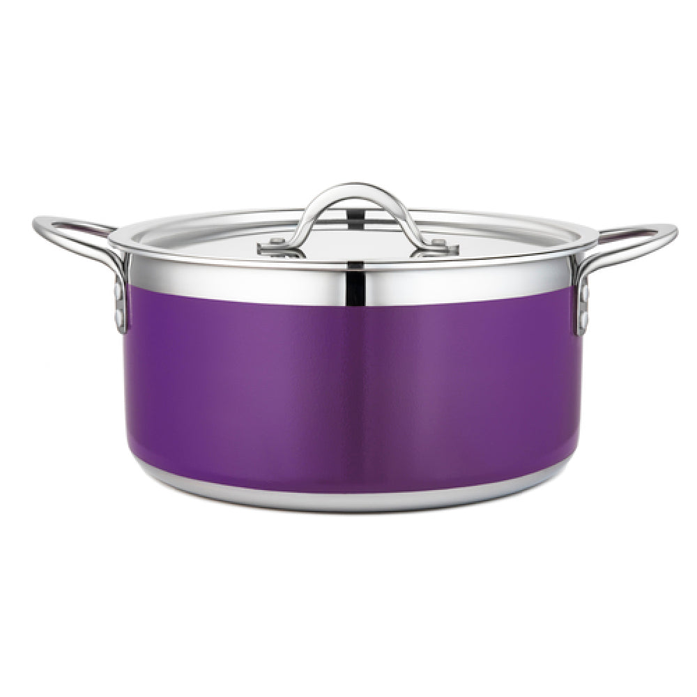 The Bon Chef 71303-CF2-P Country French X Pot is a versatile and elegantly designed cooking tool, perfect for professionals and home chefs alike. With a capacity of 5 qt. 22 oz., this pot offers ample space for preparing large meals, making it suitable for various culinary applications. Its dimensions - 10-1/8" in diameter and 4-3/4" in height - ensure it fits comfortably on any stovetop while providing sufficient depth for thorough cooking. This pot features a round shape and includes a matching lid, enhancing its utility and aesthetic appeal. The induction bottom is a standout feature, allowing for efficient heat distribution and compatibility with induction cooktops, catering to a modern kitchen's needs. Constructed from high-quality stainless steel, this pot promises durability and a sleek, professional appearance. The vibrant purple color adds a touch of personality, perfect for those looking to incorporate style into their culinary equipment. The Bon Chef 71303-CF2-P Country French X Pot combines functionality and elegance, making it an excellent choice for a range of markets, from high-end restaurants to cozy home kitchens, where both performance and design are highly valued.