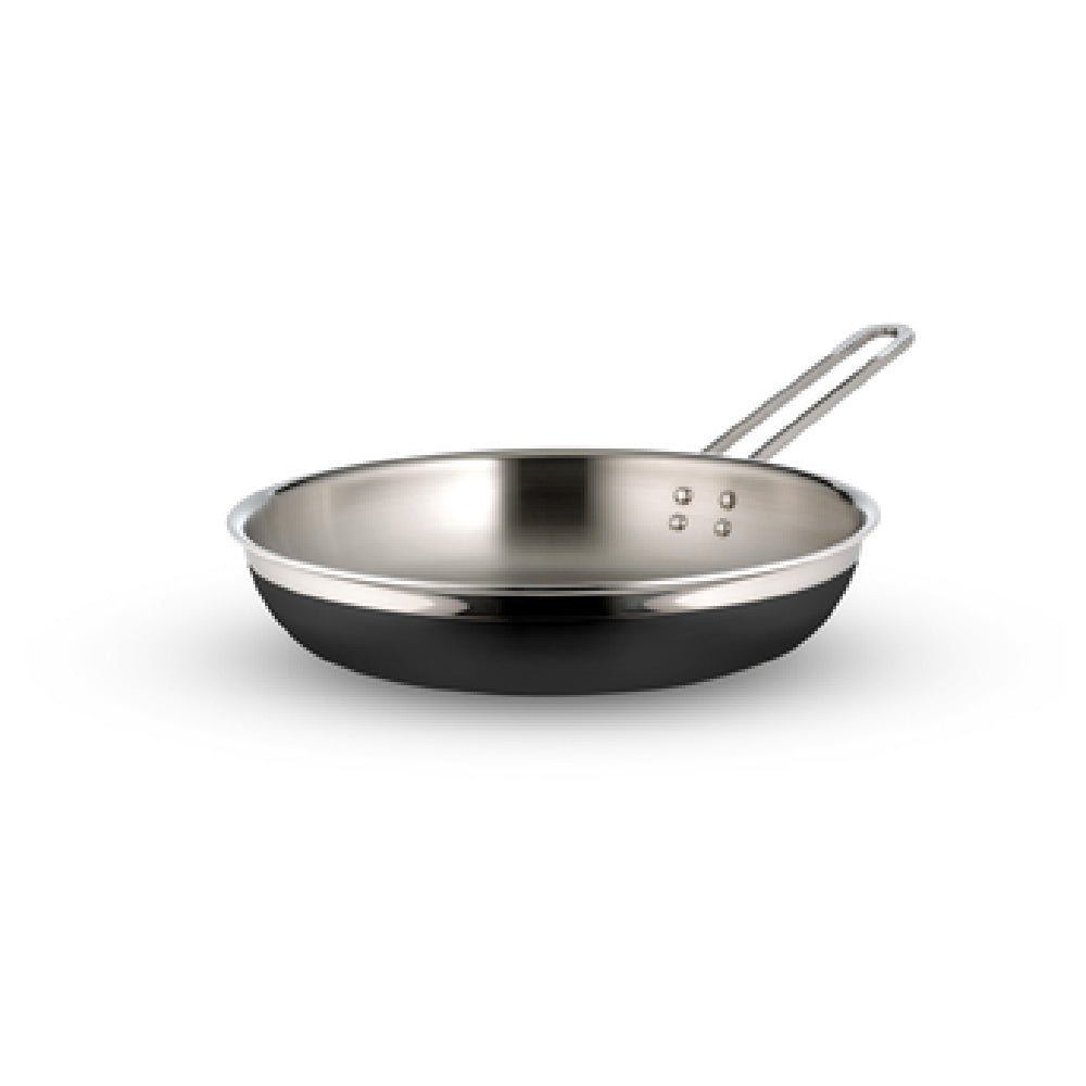 The Bon Chef 71308-CF2-B Country French X Saute Pan/Skillet is a versatile kitchen essential, expertly crafted for culinary professionals and home chefs alike. With a capacity of 2 qt. 12 oz., this pan is ideal for a variety of cooking tasks, from searing to sautéing. The 11" diameter and 2-1/8" height offer a generous surface area while maintaining a manageable size for easy handling. Designed without a lid, this saute pan is equipped with a long handle, ensuring a firm grip and safe maneuverability. Its induction bottom allows for efficient heat distribution, making it compatible with induction cooktops and enhancing energy efficiency. Constructed from durable stainless steel, this black skillet offers a sleek, professional appearance and resists corrosion, ensuring longevity. The Bon Chef 71308-CF2-B is particularly suited to the demands of both commercial kitchens and sophisticated home cooking environments, delivering reliable performance across different segments of the culinary industry. Its blend of style, durability, and functionality makes it a must-have tool for those seeking precision and quality in their cooking equipment.