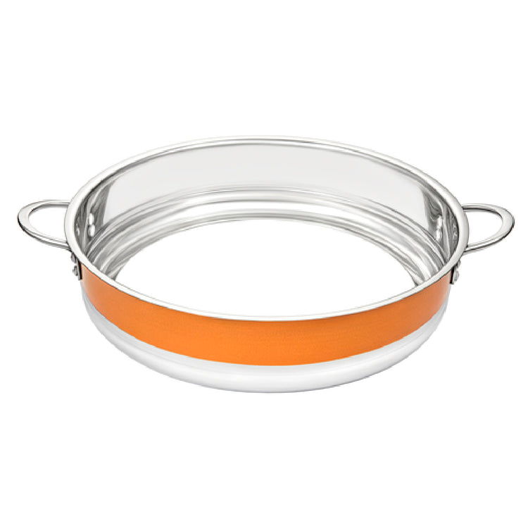 The Bon Chef 72032-BL-O Country French X Steam Table Food Pan Ring is a precisely crafted kitchen accessory, engineered with a focus on functionality and design. This round, bottomless pan ring measures 14-3/4 inches in diameter and stands 3-3/8 inches high, offering ample space for diverse culinary applications. Constructed from durable stainless steel, it ensures longevity and resistance to wear and tear, meeting the rigorous demands of professional kitchens. The vibrant orange color adds a touch of aesthetic appeal, making it a visually striking addition to any steam table setup. This product is ideally suited for use in the food service industry where maintaining heat and presentation are paramount. Its bottomless design enhances versatility, allowing chefs to present and serve dishes directly from the steam table with ease and elegance. The Bon Chef 72032-BL-O is a standout solution for caterers, hotels, and restaurants looking for reliability and style in their food presentation equipment.