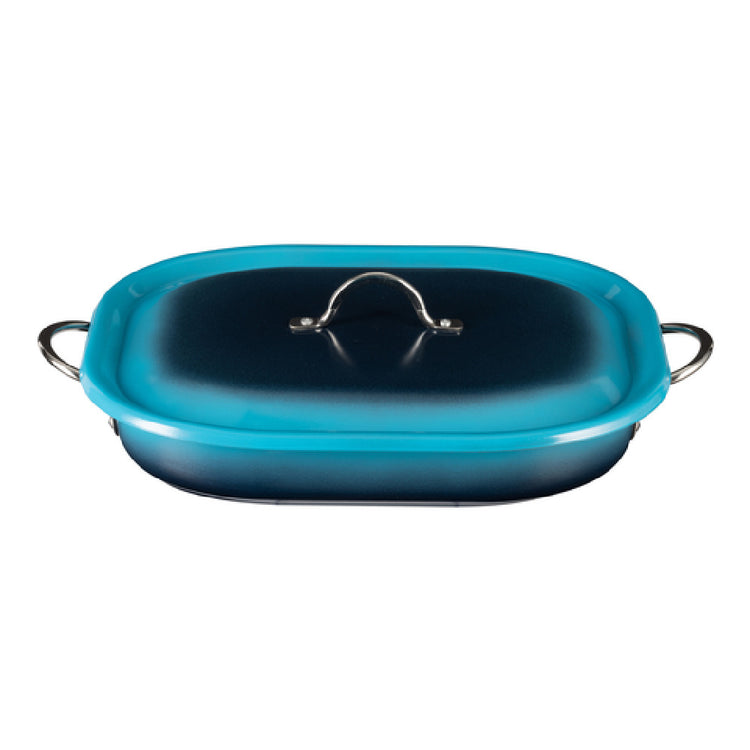 The Bon Chef 73023-OM-C Country French X Ombre Roasting Pan is a high-quality culinary tool that stands out in both functionality and style. With a capacity of 5 quarts and dimensions of 15 inches by 11 inches by 2 7/8 inches, this oblong pan is designed for versatile cooking applications, suitable for both personal and professional kitchens. It comes with a lid, enhancing its utility by trapping moisture and flavors during the cooking process. The pan is equipped with two 2-inch round riveted handles, ensuring a secure grip and easy handling in and out of the oven. Crafted from 5-ply stainless steel, it promises durability and even heat distribution, making it induction ready and ideal for various cooking surfaces. Its Caribbean Blue finish adds a touch of elegance, making it not only a practical choice but also a visually appealing addition to any cookware collection. The roasting pan is oven and dishwasher safe, offering convenience in both cooking and cleaning. The Bon Chef 73023-OM-C is a perfect choice for culinary enthusiasts and professionals who value quality, durability, and style in their cookware. Its thoughtful design and robust build cater to diverse market segments, from home cooks to chefs in high-volume kitchens.
