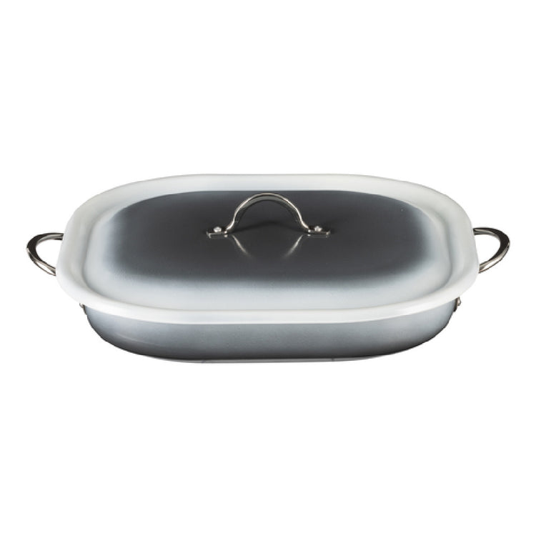 The Bon Chef 73023-OM-S Country French X Ombre Roasting Pan is a versatile cooking essential designed for both home cooks and professional chefs. With a generous capacity of 5 quarts, this oblong roasting pan measures 15 inches by 11 inches with a depth of 2 7/8 inches, providing ample space for roasting a variety of dishes. The pan comes with a lid and features two 2-inch round riveted handles for secure handling. Its construction includes 5-ply stainless steel, ensuring even heat distribution and durability, making it oven and dishwasher safe for convenience. The roasting pan is induction ready, adding to its versatility in different cooking environments. The Shadow Gray finish of the pan not only adds a sophisticated touch to the kitchen but also enhances its durability. This robust design caters to diverse market segments, from domestic kitchens seeking durability and style to professional establishments that require reliable, high-performance cookware. The Bon Chef 73023-OM-S Country French X Ombre Roasting Pan seamlessly blends functionality with elegance, making it an indispensable tool for culinary enthusiasts and professional chefs alike.
