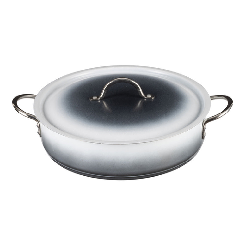 The Bon Chef 73030-OM-S Country French X Ombre Brazier Pot is a versatile culinary tool designed to meet the needs of both professional chefs and home cooks. With a 6-quart capacity, this round brazier pot measures 12 3/8 inches in diameter and stands 3 inches tall, making it ideal for preparing large meals. It comes with a matching lid and features two 2-inch round riveted handles for easy handling and transport. Constructed with a 5-ply stainless steel material, the pot is designed for durability and even heat distribution, making it suitable for a variety of cooking techniques. The shadow gray ombre finish adds a touch of elegance, making it a stylish addition to any kitchen. This brazier pot is induction ready, allowing it to be used on a variety of stovetops. Additionally, it is both oven and dishwasher safe, providing convenience and ease of maintenance for busy kitchens. The Bon Chef 73030-OM-S brazier pot is an exemplary choice for those seeking a reliable and aesthetically pleasing cookware option, combining functionality with high-quality construction tailored to the demands of the culinary industry.
