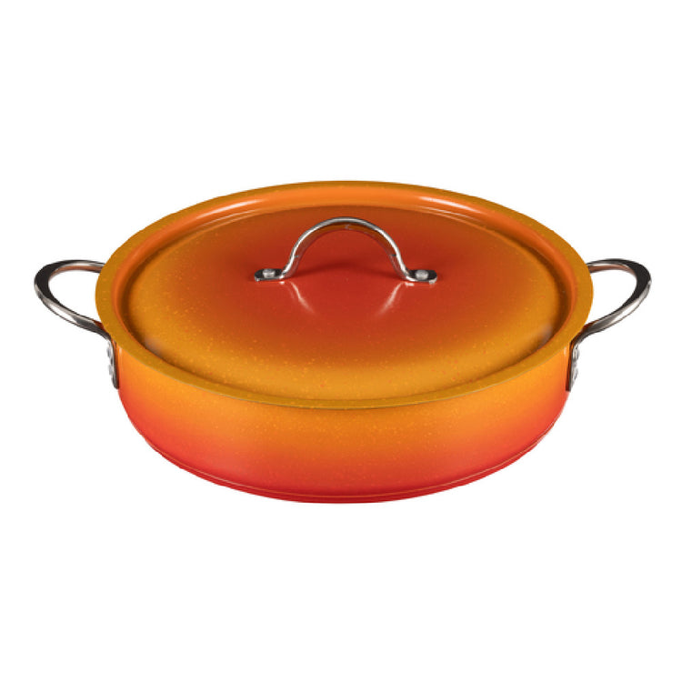 The Bon Chef 73030-OM-T Country French X Ombre Brazier Pot is a versatile culinary tool tailored for both professional and home kitchens. With a capacity of 6 quarts, this pot features a round shape with dimensions of 12 3/8 inches in diameter and a height of 3 inches, offering ample space for a variety of cooking techniques. Its construction includes a 5-ply stainless steel design, ensuring durability and efficient heat distribution across the surface, making it particularly suitable for induction cooking. The brazier pot comes with a lid that complements its robust form, allowing for greater control over cooking conditions. Equipped with two 2-inch round riveted handles, it provides secure handling and ease of transport from the stovetop to the oven, as it is oven-safe. Additionally, the pot is dishwasher-safe, simplifying the post-cooking clean-up process. The vibrant tangerine hue adds an aesthetic appeal, enhancing the visual presentation in any kitchen setting. This brazier pot is designed to meet the demands of various market segments within the culinary industry, from commercial chefs requiring reliable cookware to home cooks seeking professional-grade kitchenware. The Bon Chef 73030-OM-T embodies a blend of functionality and style, making it an indispensable addition to any cooking environment.
