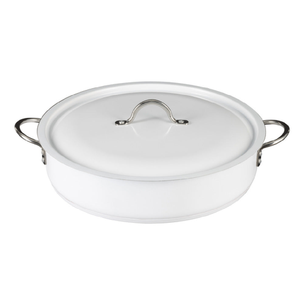 The Bon Chef 73032-OM-W Country French X Ombre Brazier Pot is a high-quality kitchen essential, specifically designed to meet the rigorous demands of both professional and home cooks. With a substantial capacity of 9 quarts, this pot is perfectly suited for preparing large meals. It measures 14 3/4 inches in diameter and 3 3/8 inches in height, providing ample cooking space for a variety of dishes. This brazier pot features a classic round shape and comes equipped with a matching lid to ensure heat retention and even cooking. Designed with two 2-inch round riveted handles, it offers secure handling and easy maneuverability. The pot's construction consists of a 5-ply stainless steel, which ensures durability and efficient thermal conductivity. Notably, it is oven and dishwasher safe, providing versatile usage and convenient cleaning options. Moreover, it is induction ready, making it compatible with a wide range of cooking technologies. The elegant white finish with an ombre design adds a touch of sophistication, making it an appealing addition to any kitchen setting. The Bon Chef 73032-OM-W brazier pot is an ideal choice for culinary professionals and enthusiasts who value performance, versatility, and timeless style in their cooking equipment.