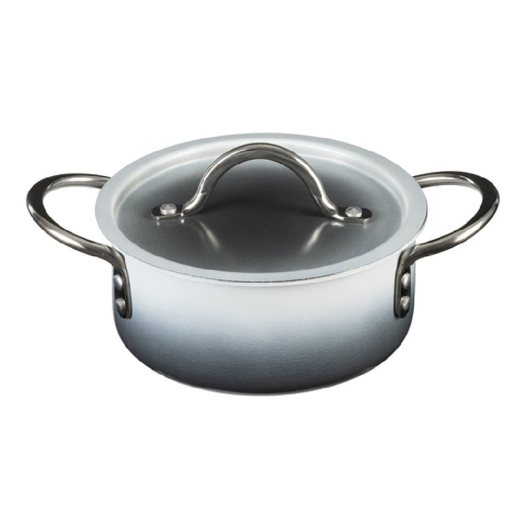 The Bon Chef 73299-OM-S Country French X Ombre Sauce Pot is a premium kitchen tool designed for optimal performance and versatility. This round sauce pot, measuring 7 inches in diameter and 3 inches in height, provides a 1-quart 22-ounce capacity, making it an excellent choice for both small-scale culinary creations and larger sauces. Featuring a pair of 2-inch round riveted handles, it ensures a secure grip, enhancing ease of transport and maneuverability in busy kitchens. The pot comes with a lid, which contributes to preserving heat and locking in flavors, essential for achieving rich and flavorful sauces. Constructed from 5-ply stainless steel, this sauce pot is built for durability and even heat distribution, making it suitable for professional chefs and home cooks alike. Its shadow gray finish adds a sophisticated aesthetic that complements a variety of kitchen décors. This versatile sauce pot is induction ready, increasing its utility across various cooking technologies, and is both oven and dishwasher safe, offering convenience in both cooking and cleaning. The Bon Chef 73299-OM-S Country French X Ombre Sauce Pot is a reliable and stylish addition to any culinary setting, catering to the demands of professional and home kitchens.