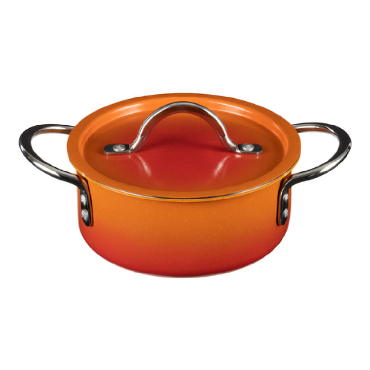 The Bon Chef 73299-OM-T Country French X Ombre Sauce Pot is a versatile piece of cookware designed for both professional and home kitchens. With a capacity of 1 quart 22 ounces, it offers ample space for preparing sauces and small dishes. Measuring 7 inches in diameter and 3 inches in height, this round pot is compact yet functional. The pot includes a matching lid and features two 2-inch round riveted handles, ensuring secure and easy handling. Constructed from 5-ply stainless steel, the pot promises durability and efficient heat distribution, making it suitable for a variety of cooking needs. Its tangerine ombre finish adds a vibrant touch to any kitchen setting. The Bon Chef 73299-OM-T is both oven and dishwasher safe, providing convenience in both cooking and cleaning processes. Additionally, it is induction ready, making it compatible with a wide range of stovetops. This sauce pot is an ideal choice for culinary professionals and home chefs who value high-quality cookware that combines style with functionality.