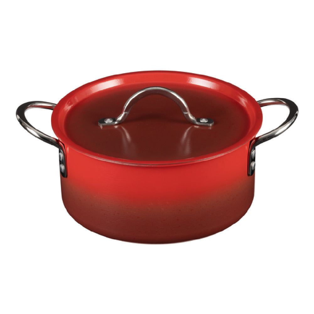 The Bon Chef 73301-OM-CR Country French X Ombre Sauce Pot 3 Qt 9 Oz 8 5/8"D X 3 7/8"H is a meticulously crafted kitchen essential designed for those who value both functionality and style. This round sauce pot comes complete with a lid and is equipped with (2) 2" round riveted handles, enhancing its usability and safety during handling. Its dimensions, 8 5/8 inches in diameter and 3 7/8 inches in height, provide a substantial capacity of 3 quarts and 9 ounces, making it ideal for preparing a variety of sauces and dishes. Constructed with 5-ply stainless steel, this pot ensures even heat distribution, which is essential for precision cooking. The induction-ready feature broadens its applicability across different heating methods, catering to various culinary environments. Its oven and dishwasher-safe properties allow for versatile cooking techniques and ease of maintenance. The crimson red color adds a vibrant touch to your kitchen, combining both aesthetic appeal and durability. This sauce pot is a valuable addition to both professional kitchens and home cooking spaces, offering reliable performance for a range of cooking applications.