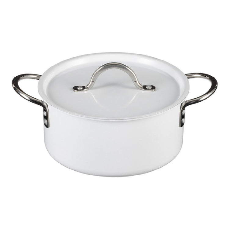 The Bon Chef 73301-OM-W Country French X Ombre Sauce Pot is a meticulously crafted kitchen essential, boasting a capacity of 3 qt 9 oz, making it suitable for both home cooks and professional chefs. This round sauce pot includes a lid and features dual 2-inch round riveted handles for secure handling. With dimensions of 8 5/8 inches in diameter and 3 7/8 inches in height, it provides ample space for preparing sauces, soups, and stews. The pot is designed for versatility and durability with its 5-ply stainless steel construction, ensuring even heat distribution and long-lasting performance. The pot is both oven and dishwasher safe, adding convenience to its list of attributes. Additionally, it is induction ready, catering to modern cooking appliances. The elegant white finish of the Bon Chef 73301-OM-W adds a touch of sophistication to any kitchen decor, while its robust build makes it a reliable choice for a variety of culinary applications. Whether used in a bustling restaurant kitchen or for family meals at home, this sauce pot excels in delivering exceptional cooking results consistently.