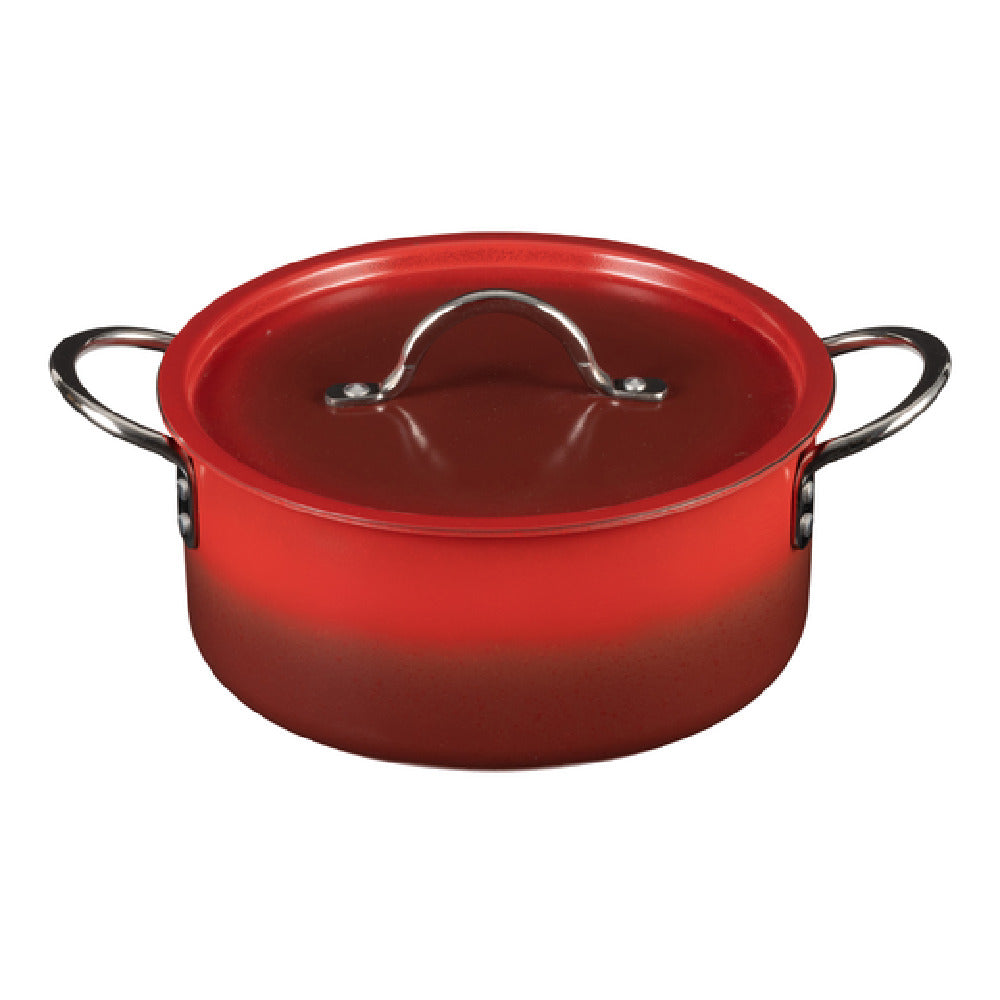The Bon Chef 73302-OM-CR Country French X Ombre Sauce Pot is a high-quality kitchenware piece designed for both professional chefs and home cooking enthusiasts. This sauce pot boasts a generous volume of 4 quarts and 9 ounces, making it ideal for preparing sauces or small batches of soups. With a diameter of 9.4 inches and a height of 4.4 inches, its round shape provides ample surface area for even heat distribution. The pot is equipped with a lid and two 2-inch round riveted handles for secure handling. Constructed with 5-ply stainless steel, the pot ensures durability and excellent heat conduction. Its eye-catching Crimson Red exterior adds a touch of elegance to any kitchen setting. The Bon Chef 73302-OM-CR is oven and dishwasher safe, offering convenience in both cooking and cleaning. Additionally, it is induction ready, making it suitable for modern cooking applications. This versatile and functional sauce pot is a valuable addition to any culinary environment, ensuring reliability and style for various cooking needs.