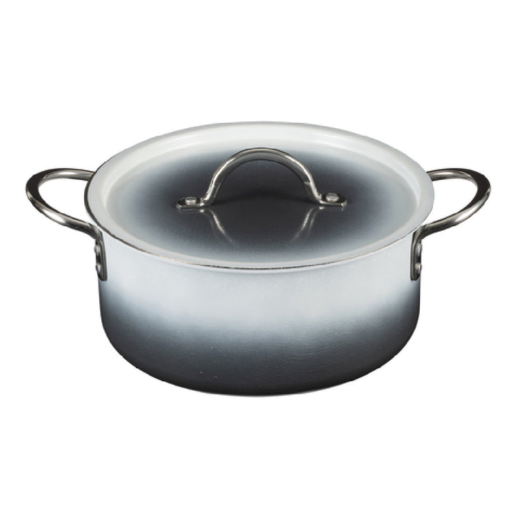 The Bon Chef 73302-OM-S Country French X Ombre Sauce Pot 4 Qt 9 Oz is a versatile kitchen essential, meticulously designed for culinary professionals and home chefs seeking reliable and stylish cookware. This round sauce pot, with a 9.4-inch diameter and a height of 4.4 inches, provides ample capacity for various cooking needs, making it suitable for preparing soups, sauces, and stews. Crafted with a sturdy 5-ply stainless steel construction in an elegant shadow gray finish, it ensures exceptional heat distribution and durability. The pot is equipped with two 2-inch round riveted handles, offering ease of handling and transport. Its compatibility with induction cooktops expands its usability across diverse cooking environments. The inclusion of a lid aids in retaining heat and moisture during the cooking process. As it is oven and dishwasher safe, this sauce pot simplifies both cooking and cleaning tasks, enhancing efficiency in busy kitchen settings. The Bon Chef 73302-OM-S sauce pot stands out with its combination of functional design and aesthetic appeal, catering to the demands of different market segments within the hospitality and home kitchen industries, where quality and reliability are paramount.
