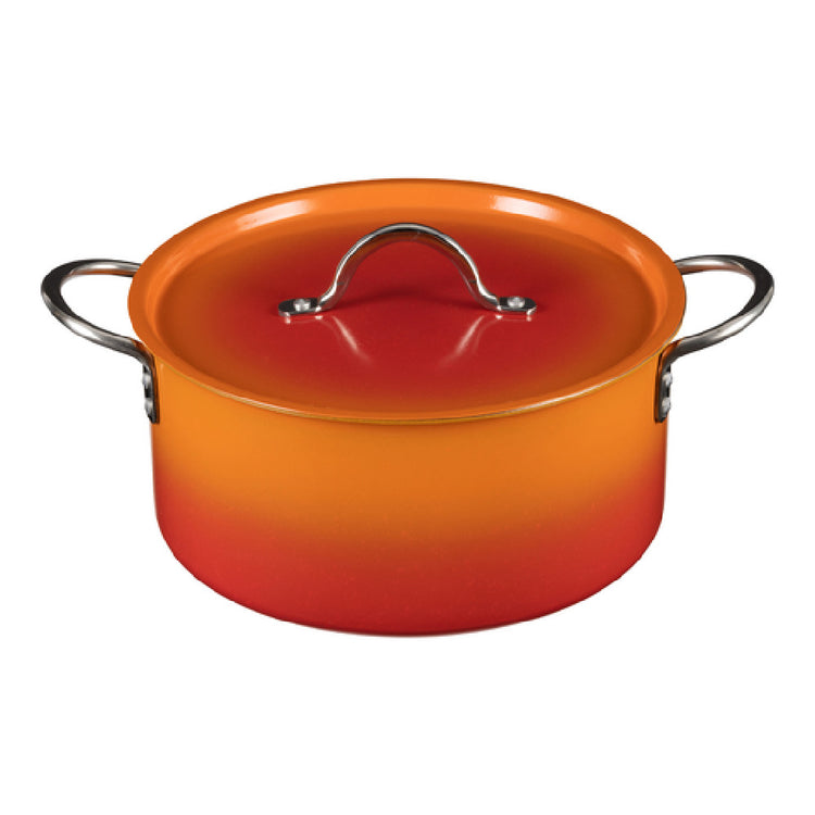 The Bon Chef 73303-OM-T Country French X Ombre Sauce Pot is a meticulously designed kitchen essential, featuring a capacity of 5 quarts 22 ounces with a diameter of 10 inches and a height of 4.75 inches, making it suitable for a variety of culinary applications. This round sauce pot is accompanied by a lid and includes two 2-inch round riveted handles, ensuring easy handling and maneuverability. Constructed with 5-ply stainless steel, it offers excellent durability and even heat distribution, making it induction ready. The vibrant tangerine ombre finish adds a touch of elegance and style, perfect for both professional and home kitchens. This sauce pot's oven and dishwasher-safe properties provide convenience and flexibility in cooking and cleaning processes. Its robust construction makes it an ideal choice for chefs and culinary enthusiasts who prioritize quality and efficiency in their cooking endeavors. Whether used in a high-paced restaurant environment or a leisurely home kitchen, the Bon Chef 73303-OM-T Country French X Ombre Sauce Pot embodies a blend of practicality and aesthetic appeal, catering to diverse market segments within the culinary industry.