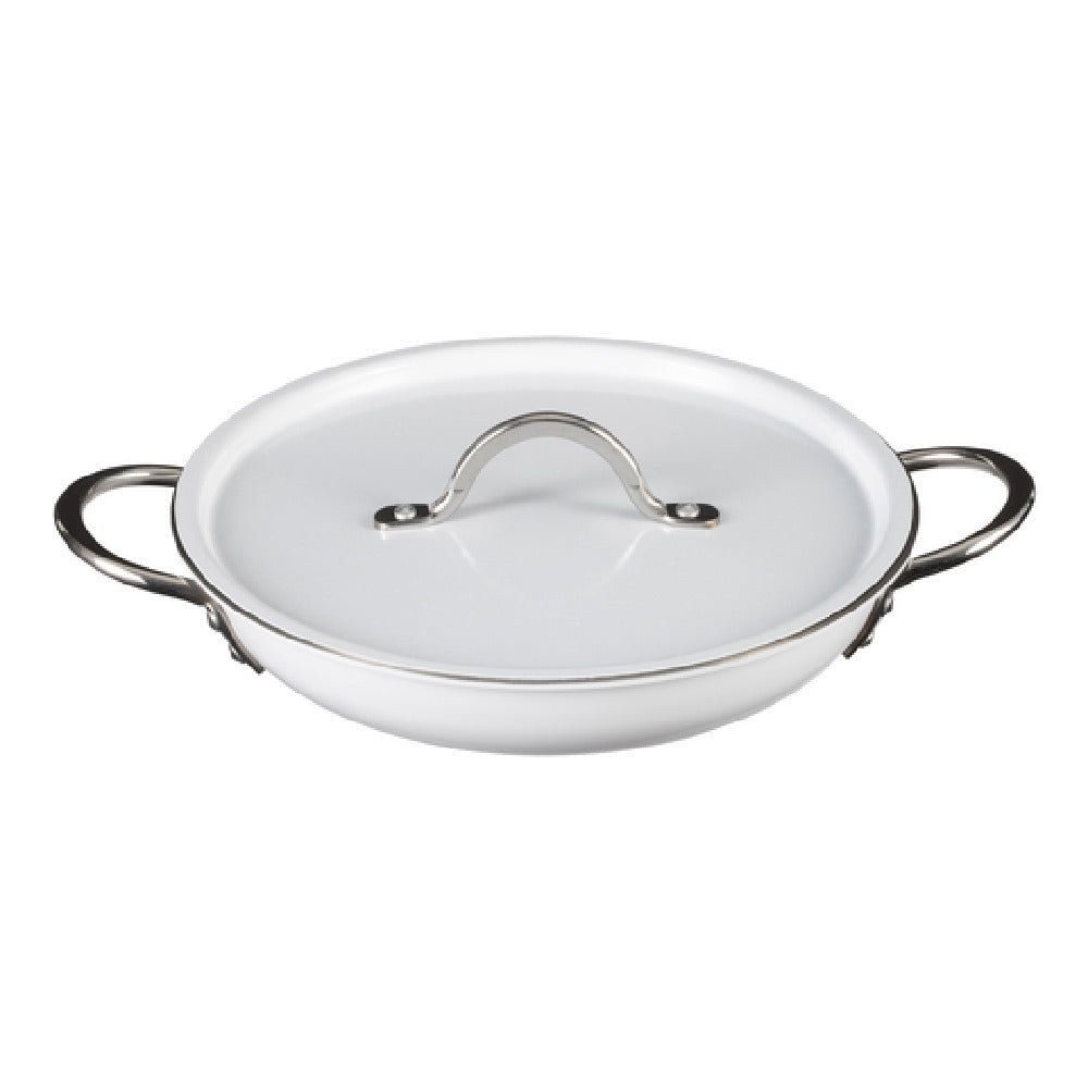 The Bon Chef 73304-OM-W Country French X Ombre Saute Pan is a premium culinary tool characterized by its impressive 1 quart 20 ounce capacity, making it a versatile option for various cooking endeavors. With a diameter of 10 inches and a height of 2 inches, this round saute pan is thoughtfully designed to cater to the needs of culinary professionals and home chefs alike. It features two 2-inch round riveted handles that ensure a secure grip, enhancing safety and ease of use during cooking. This saute pan is constructed with a robust 5-ply stainless steel, offering durability and exceptional heat distribution, which is especially beneficial for precision cooking. Its white finish adds a touch of elegance, making it an attractive addition to any kitchen. Designed for modern convenience, the Bon Chef 73304-OM-W is both oven and dishwasher safe, simplifying maintenance and allowing for versatile cooking methods. Additionally, it is induction ready, providing compatibility with a range of cooking surfaces. Complete with a lid, this saute pan is a comprehensive solution for those seeking quality, style, and functionality in their kitchenware, suitable for both residential and commercial use in the culinary industry.