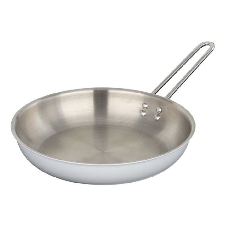The Bon Chef 73309-OM-W Country French X Ombre Saute Pan is a professional-grade cooking vessel designed for both performance and style. With a capacity of 3 quarts 4 ounces, it provides ample space for sautéing and frying tasks. The pan measures 11.25 inches in diameter and 2.75 inches in height, making it a versatile addition to any kitchen. Notably, this model features a single 7-inch long riveted handle, ensuring a secure grip and ease of maneuverability. Constructed from 5-ply stainless steel, the pan is both oven and dishwasher safe, offering convenience and durability. The white ombre finish adds an aesthetic appeal that complements any kitchen decor. Additionally, this sauté pan is induction ready, aligning with modern cooking technologies, thereby catering to professional chefs and home cooks who value efficiency and versatility. Its robust construction ensures even heat distribution, while the absence of a lid provides flexibility in cooking methods. The Bon Chef 73309-OM-W is designed for those who appreciate high-quality materials and meticulous craftsmanship, making it ideal for diverse culinary applications, from gourmet kitchens to everyday cooking.