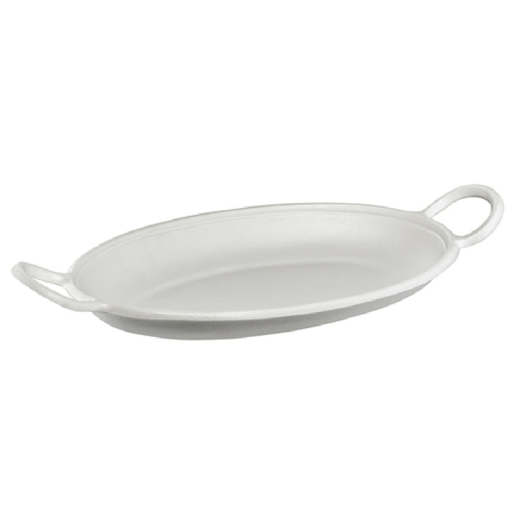 The Bon Chef 80071TEAL Tray - 26" x 13" x 2-1/4" oval - is a versatile serving solution crafted to meet the demands of various industry segments. Designed with integrated handles, this tray ensures ease of transport, enhancing functionality for catering and hospitality sectors. Constructed from durable aluminum and finished with a ceramic-look coating, it presents an elegant Sandstone Teal design that blends style with practicality. The tray's dimensions, 26 inches in length, 13 inches in width, and 2-1/4 inches in depth, make it suitable for presenting a variety of culinary creations, from appetizers to main courses, while making an aesthetic statement. The choice of material not only gives it a sophisticated finish but also ensures long-term durability, making it suitable for high-traffic environments such as restaurants, hotels, and banquet facilities. The Bon Chef 80071TEAL Tray is an ideal addition to any professional setting, offering a balance of form and function, and catering to the needs of both back-of-house operations and front-of-house presentation requirements.