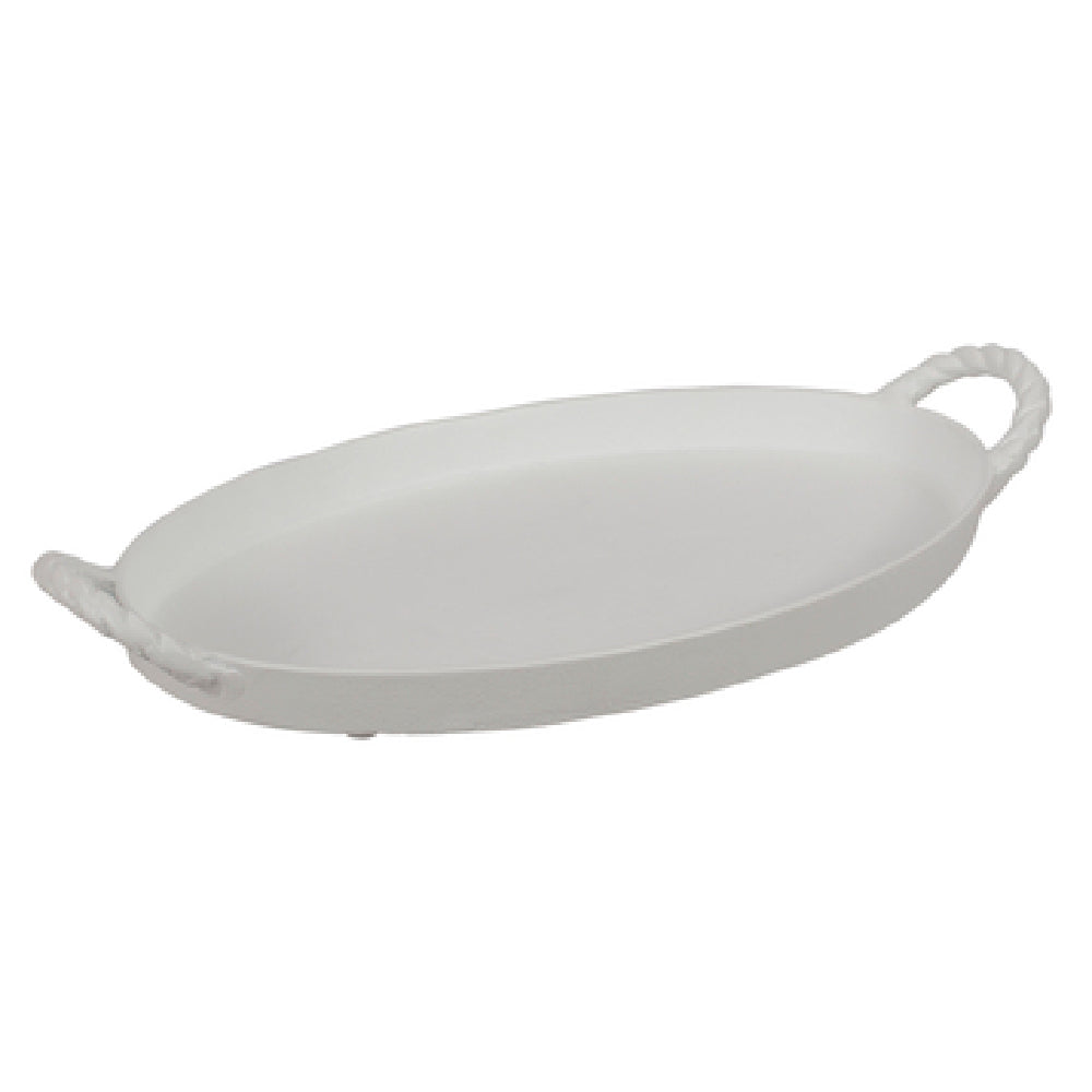 The Bon Chef 80110PLUM Tray 15" X 9-7/16" X 1-5/8"H Oval is a meticulously crafted serving piece designed to elevate dining experiences in various industry segments, from luxury restaurants to catering services. Featuring dimensions of 15 inches in length, 9-7/16 inches in width, and a height of 1-5/8 inches, this oval tray provides ample space for presenting appetizers, entrees, or desserts with elegance. The tray's distinctive rope handle not only adds a touch of sophistication but also ensures easy handling and maneuverability, making it an ideal choice for busy service environments. Constructed from high-quality aluminum, it boasts a unique ceramic-look coating that offers the aesthetic appeal of ceramic with the durability and lightweight characteristics of aluminum. The Sandstone Plum finish further enhances its visual allure, making it a striking addition to any table setting. This tray's combination of style, durability, and functionality positions it as a versatile accessory suitable for diverse culinary presentations, catering to the needs of both upscale and casual dining establishments. With its robust construction and attention to detail, the Bon Chef 80110PLUM Tray is designed to withstand the rigors of professional use while maintaining its refined appearance.