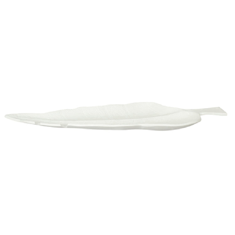 The Bon Chef 80154IVY Platter is a distinctively crafted serving piece that enhances the presentation of culinary delights across various dining settings. Measuring 24-13/16 inches in length, 7-1/2 inches in width, and 1-1/4 inches in height, this platter offers ample space for an array of dishes. Its unique leaf shape adds a touch of elegance and sophistication, making it a standout choice for upscale dining establishments, catering events, and special occasions. Constructed from aluminum, this platter features a ceramic-look coating that mimics the refined appearance of ceramic while maintaining the durability and lightweight nature of aluminum. Finished in a Sandstone Ivory hue, it seamlessly blends with a variety of table settings, from rustic to contemporary. The Bon Chef 80154IVY Platter serves as a versatile and attractive solution for different market segments, including restaurants, hotels, and catering companies, seeking to enhance their food presentation with a blend of aesthetic appeal and functional design. The platter's robust construction and sophisticated design make it an indispensable addition to any food service operation looking to elevate the dining experience with a statement piece that combines style and practicality.