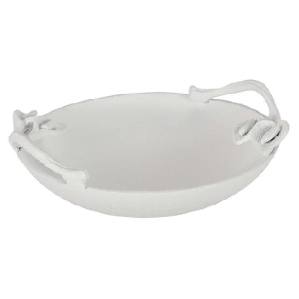 The Bon Chef 81014TAN Bowl is a meticulously crafted kitchen essential boasting a capacity of 1-3/4 quarts, ideal for a variety of food service applications. With dimensions of 11-5/8 inches in diameter and 3-1/2 inches in height, this round, footed bowl presents an elegant yet functional design, suitable for both commercial and residential use. The unique aesthetic appeal of the Bon Chef 81014TAN Bowl is attributed to its aluminum construction adorned with a ceramic-look coating, providing the durability of metal with the sophisticated appearance of ceramic. Its Sandstone Tan finish adds a touch of earth-toned elegance to any setting, while the integrated leaf handles enhance both its style and utility, offering ease of transport and handling. This bowl is particularly well-suited for environments where both style and practicality are prioritized, such as high-end restaurants, catering events, or upscale home gatherings. The combination of its lightweight yet robust build makes it versatile for various culinary presentations, from salads and side dishes to elaborate entrees. The Bon Chef 81014TAN Bowl stands out as a premium choice for those seeking a blend of aesthetic refinement and practical functionality in their serveware.