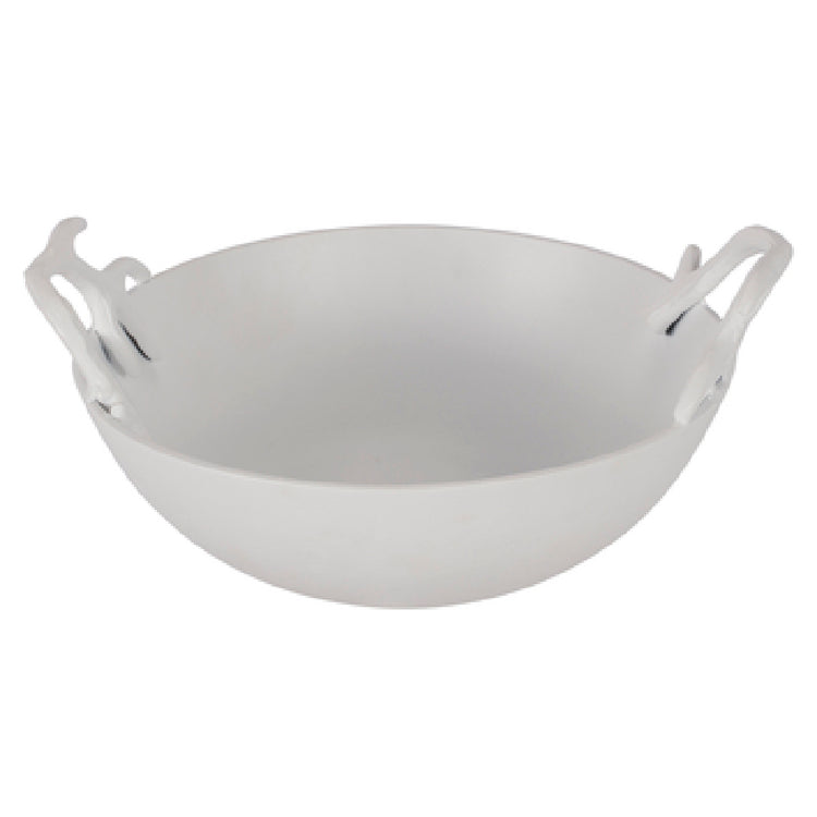 The Bon Chef 81020CARM Bowl is a versatile and elegantly designed piece of serveware, boasting a capacity of 1-7/8 quarts, making it suitable for a variety of culinary applications. With dimensions of 11-13/16 inches in diameter and 3-15/16 inches in height, this round bowl is ideal for serving large portions, making it an attractive choice for both restaurant and home use. The bowl is uniquely accented with antler handles, adding a rustic charm that distinguishes it in any setting. Constructed from durable aluminum, it features a ceramic-look coating that combines the lightweight advantages of metal with the aesthetic appeal of ceramic. The Sandstone Caramel finish is not only visually appealing but also provides a sophisticated touch to the presentation of any dish. This bowl is well-suited for caterers, banquet halls, or anyone in the hospitality industry looking to enhance their food presentation with a product that delivers both functionality and style. The Bon Chef 81020CARM Bowl's unique design and high-quality materials make it a valuable addition to any food service collection, offering a distinct blend of elegance and practicality.