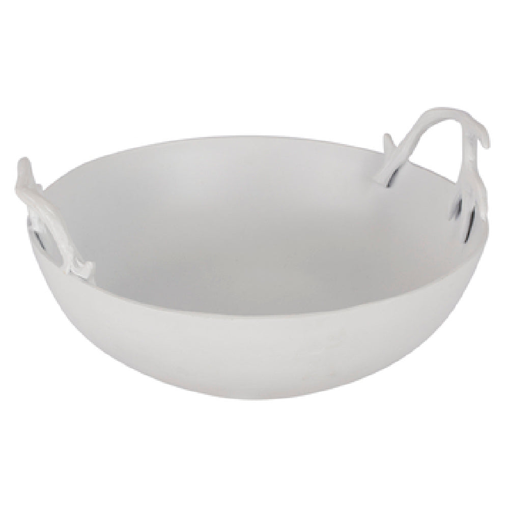 The Bon Chef 81021FGLDREVISION Bowl is a versatile 4-quart kitchen essential, boasting a 14-1/4 inch diameter and a height of 4-3/4 inches, perfect for accommodating a variety of culinary needs. This round bowl is distinctively designed with antler handles, adding a touch of rustic elegance to its aesthetic appeal, making it not only functional but also a statement piece in any setting. Constructed from durable aluminum, it features a sophisticated ceramic-look coating, ensuring longevity and a polished finish. The bowl comes in a striking Sandstone color complemented by Fiesta Gold accents, offering a unique blend of style and functionality. Ideal for both professional chefs and home cooks, its robust construction ensures it withstands the rigors of daily use while providing a visually appealing presentation. Whether used in high-end restaurants or at home for serving, the Bon Chef 81021FGLDREVISION Bowl stands out for its superior design and build quality, catering to the needs of various market segments within the food service industry. Its combination of practical design and stunning aesthetics makes it a valuable addition to any kitchen or dining setting.