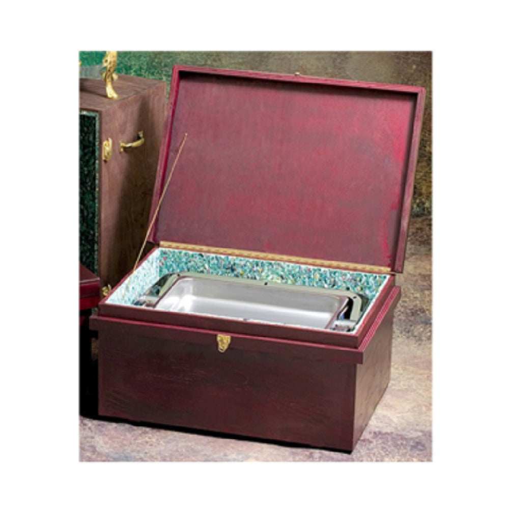 The Bon Chef 812040W Chafer Box is an expertly crafted product measuring 30 inches by 18 inches by 15 inches in height. It is specifically designed to fit Elite, Manhattan, Olympia, and stackable rectangular chafers, offering a seamless storage and transportation solution for various catering and hospitality needs. This chafer box is constructed from wood and features a sophisticated dark mahogany finish, providing both durability and an elegant aesthetic suitable for upscale events and professional settings. Its compatibility with multiple chafer models makes it a versatile choice for caterers, event planners, and food service operators who require efficient and stylish equipment management. The Bon Chef 812040W Chafer Box not only ensures the protection and organization of chafers but also enhances the overall presentation with its refined design, making it a valuable asset for any industry professional aiming to maintain high standards in their service delivery.