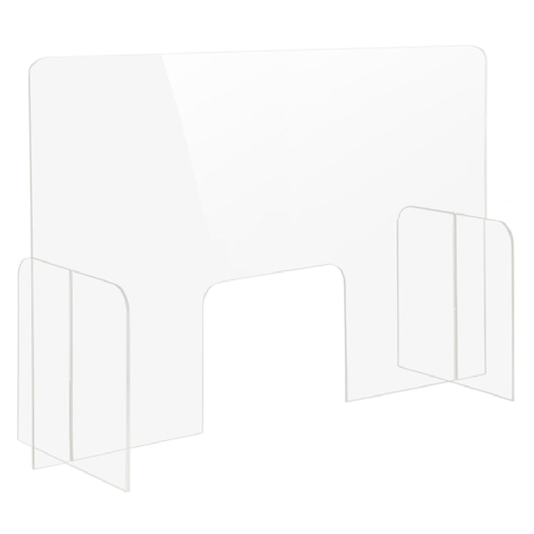 The Bon Chef 90177-7 Tabletop Health Safety Shield, measuring 36"W x 12"D x 23-3/4"H, is a meticulously crafted product designed to enhance safety and efficiency in various professional settings. Constructed from clear acrylic, this shield boasts polished edges that not only provide a sleek and clean aesthetic but also ensure durability and safety during use. One of its standout features is the 12"W x 8"H transaction window, facilitating seamless and secure exchanges between individuals while maintaining necessary health safety standards. This product is particularly valuable for environments where safety is paramount, such as retail counters, medical facilities, and service stations, as it acts as a barrier against airborne contaminants while allowing interaction. Made in the USA, the shield also assures quality and supports local manufacturing. With a lead-time of 7-10 days, the Bon Chef 90177-7 is a practical solution for businesses aiming to ramp up their health safety measures promptly. Its dimensions and construction make it versatile for use across different industries where health safety shields are required, highlighting its role as a critical tool in maintaining public health and operational efficiency.