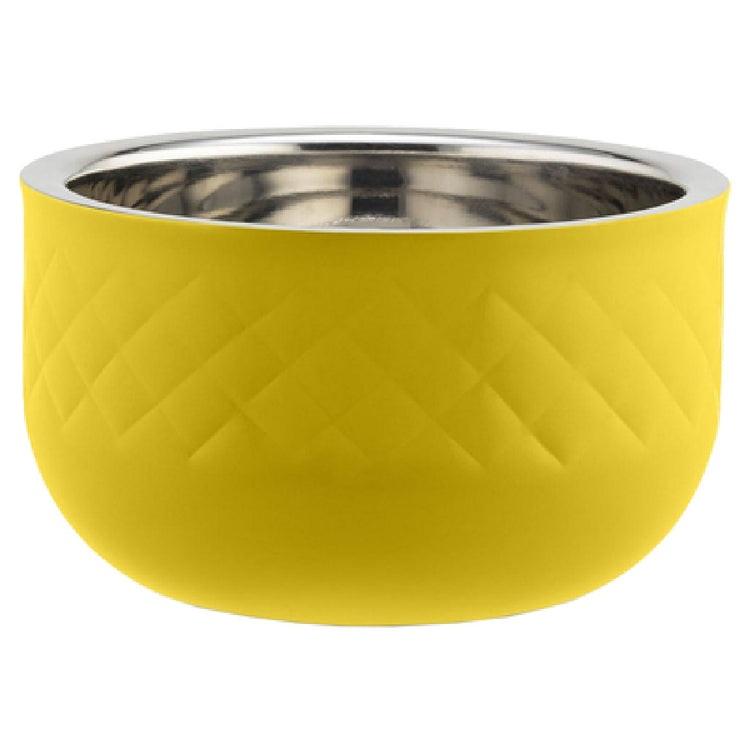 The Bon Chef 9318DIYELLOW Cold Wave Bowl 1 Qt. 20 Oz. 7-1/8" Dia. X 4-1/16"H is engineered for superior performance in maintaining food temperatures, making it a standout in the realm of food service solutions. This bowl features a round shape with a striking diamond design, adding a touch of elegance to its functional prowess. The triple-wall construction allows for pre-freezing, which ensures that the bowl can keep food cold for up to 8 hours at ambient temperature, making it ideal for buffets, catering events, or any setting where maintaining cold food temperatures is crucial. This cold wave bowl also includes a stackable plastic cover, facilitating efficient storage and transportation, which is essential for busy kitchens and catering services. Constructed from high-quality stainless steel, it offers both durability and a sophisticated appearance with its vibrant yellow finish. With a diameter of 7-1/8 inches and a height of 4-1/16 inches, this bowl provides ample space while maintaining a compact form. Its unique properties and thoughtful design make the Bon Chef 9318DIYELLOW Cold Wave Bowl a versatile and reliable choice for a range of food service applications, appealing to various market segments within the industry.