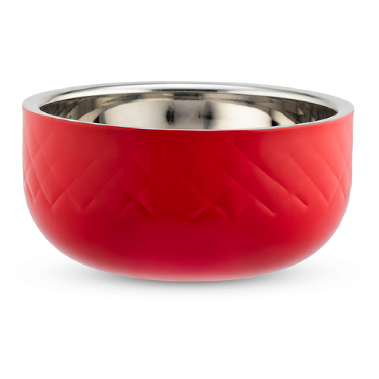The Bon Chef 9319DIRED Cold Wave Bowl is a sophisticated serving solution, specifically designed to maintain food freshness and temperature for extended periods. This bowl boasts a 3.5-quart capacity, making it an ideal choice for catering events, buffet setups, and professional kitchens requiring efficient cold food presentation. With dimensions of 9-7/8 inches in diameter and 4-3/4 inches in height, it presents a balanced size suitable for various food-serving needs. The bowl's standout feature is its triple-wall construction, engineered to keep food cold for up to 8 hours at ambient temperature, eliminating the need for constant refrigeration. This capability is enhanced by a unique pre-freezing design, which ensures optimal temperature retention. The bowl's round shape is accentuated by an elegant diamond design, adding a touch of sophistication to any table setting. Constructed from durable stainless steel, it is finished in a striking red, offering both functionality and aesthetic appeal. A stackable plastic cover is included, allowing for easy storage and transport. Whether used in high-end restaurants, catering services, or at lavish events, the Bon Chef Cold Wave Bowl stands out as a reliable and stylish option for maintaining food quality and presentation.