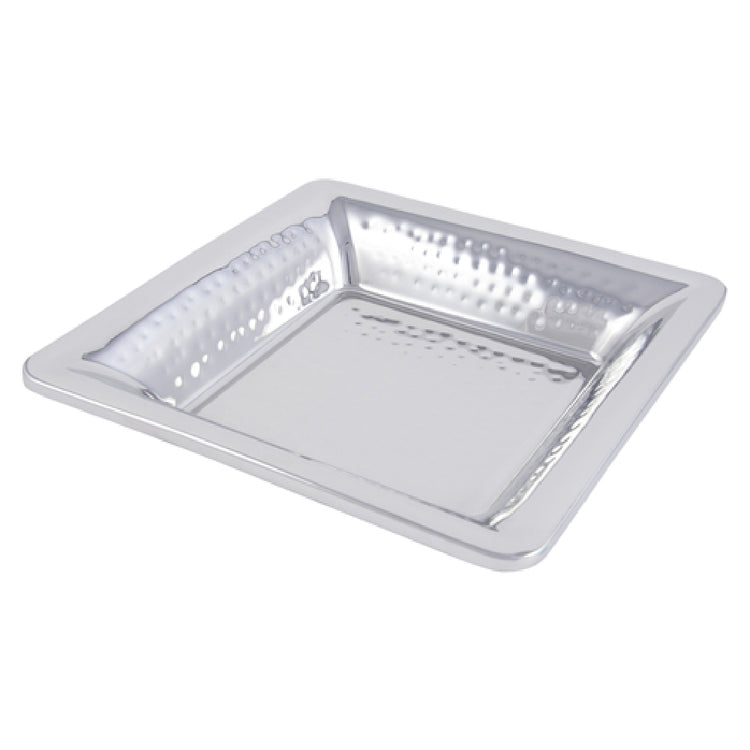 The Bon Chef 9322H Cold Wave Platter is a uniquely engineered serving solution, measuring 11-7/8 inches by 11-7/8 inches by 2-1/4 inches, designed to meet the demands of diverse industry segments, including hospitality and catering. This square platter stands out with its gel-filled, double-wall construction, which ensures that cold items maintain their temperature for extended periods, enhancing the dining experience in buffet presentations or catered events. Crafted from high-quality stainless steel, it boasts a sophisticated hammer finish that not only adds an aesthetic appeal but also increases its durability and resistance to wear. The innovative design of the Bon Chef 9322H makes it an indispensable tool for any professional setting where maintaining the integrity of cold dishes is crucial. Its technical specifications cater to the needs of chefs and caterers looking for reliable, high-performance serveware that blends functionality with elegance. The platter's design is particularly beneficial for environments requiring long-lasting temperature control without the need for electricity, making it an environmentally friendly choice as well. This combination of features ensures that the Bon Chef 9322H Cold Wave Platter is not only a practical solution but also a stylish addition to any service setup.