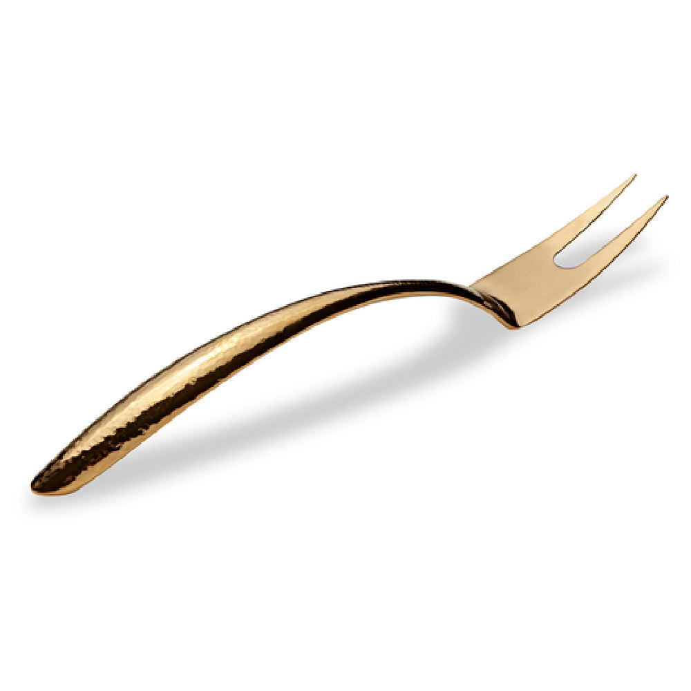 The Bon Chef 9455HFG EZ Use Banquet Serving Fork 14" Hollow Cool Handle is a masterfully crafted serving utensil, distinguished by its impressive design and technical specifications. This serving fork spans a notable length of 14 inches, providing ample reach for serving large dishes at banquets and events. Constructed from high-quality 18/8 stainless steel, this piece boasts durability and resistance to corrosion, making it ideal for both professional and home settings. The hollow cool handle is an ergonomic feature that ensures comfort and ease of use during extended service times, preventing heat transfer for a safer grip. Additionally, the fork is PVD coated, offering enhanced surface strength and a luxurious gold finish that adds an elegant touch to any dining presentation. The hammered finish further accentuates its aesthetic appeal, making it a standout piece in any culinary collection. Designed to meet the demands of the hospitality industry, this banquet serving fork seamlessly combines functionality with style, making it a valuable tool for caterers, event planners, and culinary professionals. Its robust construction and exquisite design ensure that it will remain a reliable and stylish asset in any serving arsenal.