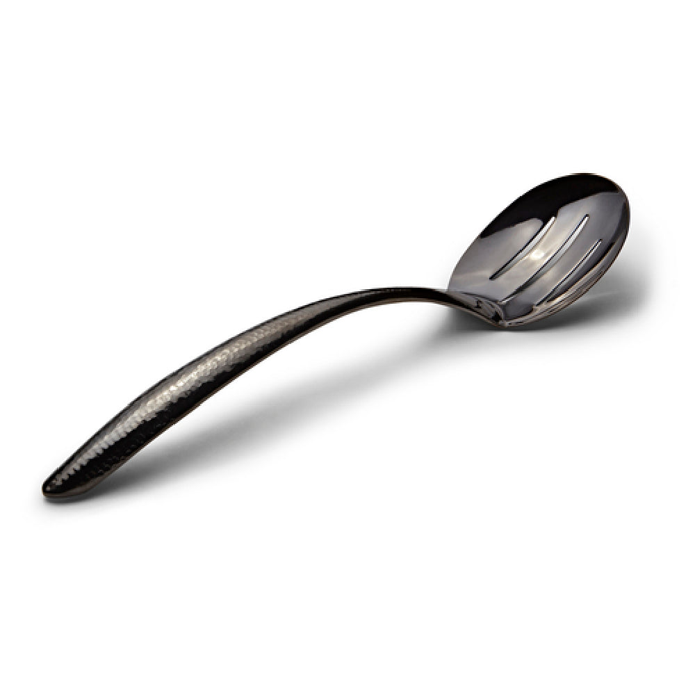 The Bon Chef 9458HFB EZ Use Banquet Serving Spoon 13-1/2" Slotted is a versatile and elegant utensil crafted for high-performance in the hospitality industry. This serving spoon is designed with a length of 13-1/2 inches, making it ideal for use in banquet settings where serving efficiency is paramount. Featuring a slotted design, it allows for precise serving of dishes with sauces or liquids, draining excess fluid for optimal presentation. The spoon is constructed from 18/8 stainless steel, renowned for its durability and resistance to corrosion, ensuring long-lasting use in demanding environments. Its PVD-coated black finish not only enhances its aesthetic appeal but also provides an additional layer of protection against wear. The hammered finish adds a touch of sophistication, making it suitable for upscale dining events. Additionally, the hollow cool handle is designed to remain comfortable to touch, even during prolonged use, enhancing the user experience by minimizing heat transfer. This combination of functional design and high-quality materials makes the Bon Chef 9458HFB serving spoon an essential tool for caterers, hotel banquet services, and high-volume culinary establishments seeking both reliability and style in their serving equipment.