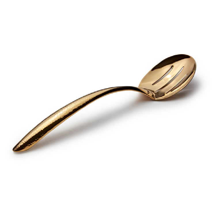 The Bon Chef 9458HFG EZ Use Banquet Serving Spoon is a meticulously crafted utensil, measuring 13-1/2 inches in length, specially designed for professional catering environments. This slotted serving spoon is constructed from high-quality 18/8 stainless steel, ensuring durability and resistance to corrosion. A standout feature is its hollow cool handle, which provides comfort during prolonged use by remaining cool to the touch even when used with hot dishes. The spoon is PVD coated in a luxurious gold finish, enhancing its visual appeal and providing an extra layer of protection against wear and tear. The hammered finish not only adds a touch of elegance but also helps in reducing visible scratches, maintaining the spoon's pristine appearance over time. Ideal for use in banquet settings, this versatile tool is perfect for serving a variety of dishes, from vegetables to pastas, while the slotted design allows for easy draining of excess liquids. The Bon Chef 9458HFG EZ Use Banquet Serving Spoon is a premium choice for catering professionals who require a reliable, stylish, and functional serving solution that meets the demands of high-volume food service operations.