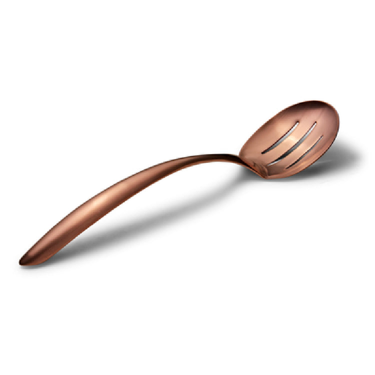 The Bon Chef 9458RGM EZ Use Banquet Serving Spoon 13-1/2" Slotted is an elegantly designed utensil that stands out for its functional and aesthetic qualities. Crafted from 18/8 stainless steel, this serving spoon is highly durable and resistant to corrosion, making it ideal for repeated use in high-volume banquet settings. Its hollow cool handle design ensures a comfortable grip, minimizing heat transfer to the user’s hand, which is crucial during prolonged serving tasks. The slotted design of the spoon is particularly useful for serving foods that need straining, such as vegetables or pasta, allowing excess liquid to drain away efficiently. The product's PVD coating in a rose gold hue provides an additional layer of durability while enhancing its visual appeal with a matte finish, offering a sophisticated touch to any buffet or dining presentation. This serving spoon is designed with versatility in mind, suitable for various market segments including catering services, hotel banquet halls, and upscale dining establishments. Its combination of practicality and style makes the Bon Chef 9458RGM a valuable tool for professionals seeking reliable and elegant serving solutions.