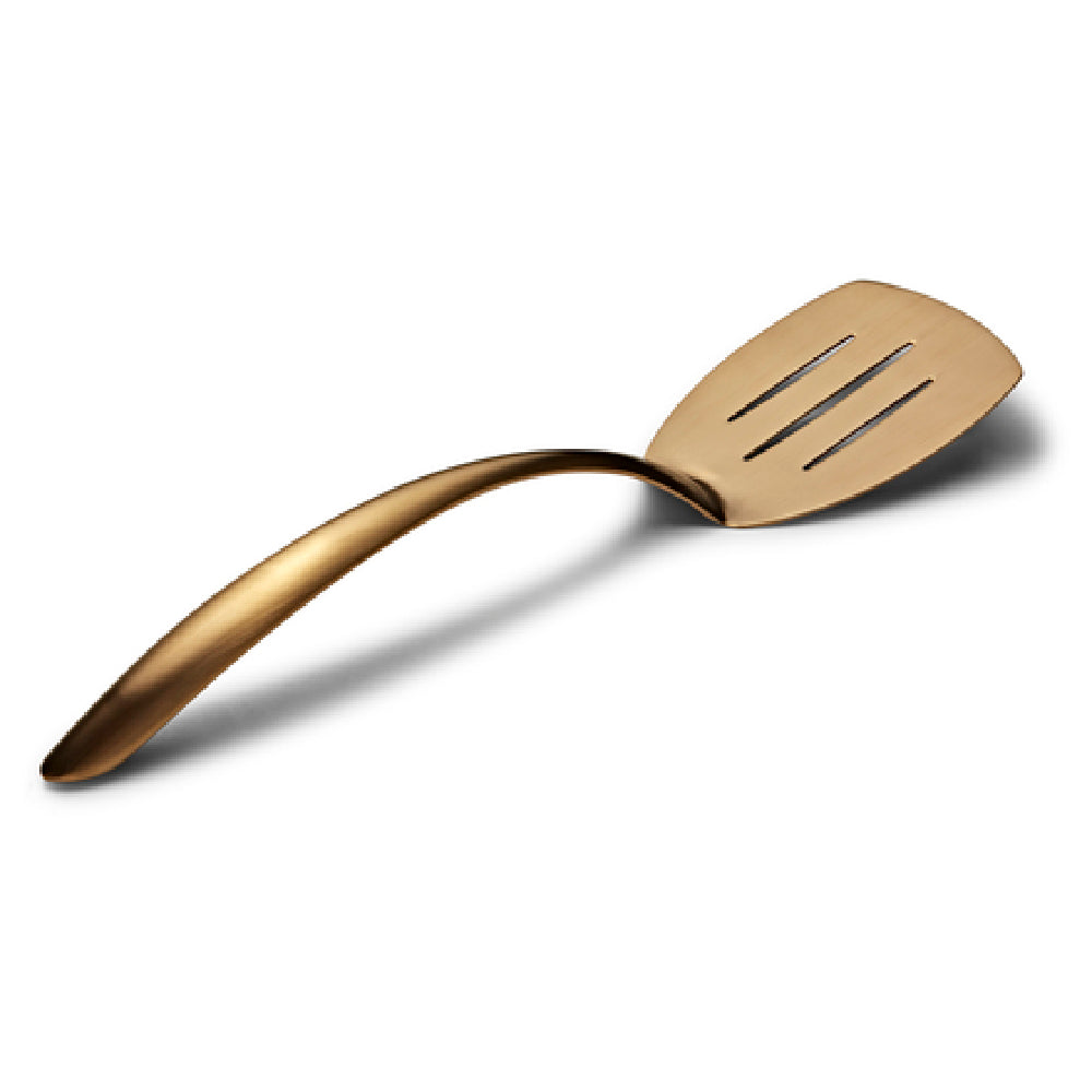 The Bon Chef 9460GM EZ Use Banquet Serving Turner - 14-3/4" Slotted is a distinguished serving tool crafted for efficiency and elegance in the culinary industry. Constructed from high-quality 18/8 stainless steel, it ensures durability and corrosion resistance, making it suitable for frequent use in high-volume environments such as banquets or catering events. The turner's slotted design aids in the effortless serving of various dishes, allowing for effective drainage of excess liquids. Measuring at 14-3/4 inches, it provides an optimal length for comfortable handling and maneuverability. A notable feature is its hollow cool handle, which minimizes heat transfer, ensuring user safety and comfort during prolonged use. The turner is enhanced with a sophisticated PVD coating, offering a gold, matte finish that not only elevates its aesthetic appeal but also adds an extra layer of protection to the stainless steel surface. This combination of functionality and style makes the Bon Chef 9460GM a versatile choice for different market segments, including professional chefs, catering services, and hospitality venues, where both performance and presentation are pivotal. The turner's design and materials reflect a commitment to quality and innovation, delivering a reliable kitchen tool that enhances any culinary setup.