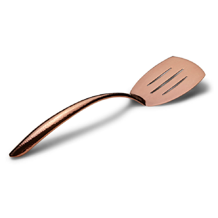 The Bon Chef 9460HFRG EZ Use Banquet Serving Turner 14-3/4" Slotted is a meticulously designed tool for professional culinary environments, emphasizing both form and function. This serving turner is crafted from high-quality 18/8 stainless steel, known for its durability and resistance to corrosion, making it a reliable choice for banquet halls and catering services. The slotted design allows for precise serving and handling of food, enhancing its functionality in high-paced kitchen settings. One of its standout features is the hollow cool handle, which ensures comfort and safety during use, preventing heat transfer even during prolonged usage. The turner is PVD coated, offering an elegant rose gold finish that not only enhances its aesthetic appeal but also provides additional protection to the surface, ensuring longevity. The hammered finish adds a touch of sophistication, making it suitable for front-of-house service where presentation is key. Measuring 14-3/4 inches, this serving turner is designed to provide optimal leverage and control, addressing the needs of various market segments within the food service industry, from high-end restaurants to casual dining establishments, where both functionality and style are paramount.