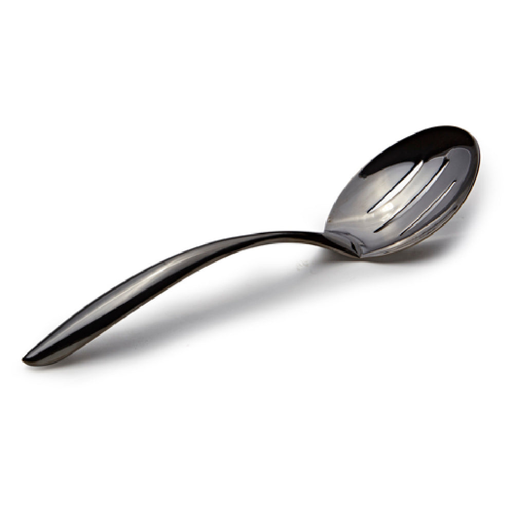 The Bon Chef 9464B EZ Use Banquet Serving Spoon is a meticulously crafted kitchen tool, measuring 9-3/4 inches in length and designed to cater to varied culinary environments. It boasts a slotted design, making it an ideal choice for serving dishes that require draining excess liquid, such as vegetables or pasta. This serving spoon is constructed from high-grade 18/8 stainless steel, ensuring durability and resistance to corrosion, while the PVD coating adds an elegant black, mirror finish, enhancing its visual appeal and offering a modern aesthetic for banquet settings. The spoon's hollow cool handle is specifically engineered to stay cool to the touch, providing comfort and safety during extended use, which is essential in busy hospitality settings. With a capacity of 1 ounce, it allows for precise portion control, aiding in food cost management and serving consistency in catering services, buffets, and banquet halls. The Bon Chef 9464B serving spoon seamlessly combines functionality with style, serving as an indispensable tool in the foodservice industry, suitable for professional chefs, restaurateurs, and caterers who value both form and function in their service utensils.