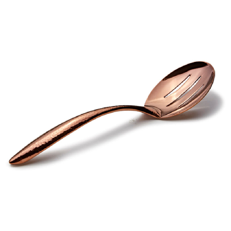 The Bon Chef 9464HFRG EZ Use Banquet Serving Spoon is a meticulously crafted utensil designed for culinary professionals seeking precision and style. This serving spoon measures 9-3/4 inches, offering an ideal balance of reach and control for serving a variety of dishes. Its 1 oz. capacity is perfect for portion control, ensuring consistent servings. The spoon features a slotted design, making it particularly suited for draining excess liquids while serving. A standout feature is its hollow cool handle, which provides an ergonomic grip while remaining cool to the touch, enhancing comfort during prolonged use. Constructed from high-quality 18/8 stainless steel, this serving spoon boasts durability and resilience, resisting rust and corrosion. The PVD coating adds a layer of sophistication with its stunning rose gold finish, complemented by a hammered texture that not only enhances its aesthetic appeal but also provides a non-slip grip. This serving spoon is ideal for use in high-end banquet settings, catering events, or upscale dining establishments, where both functionality and elegance are paramount. The Bon Chef 9464HFRG is a versatile and stylish addition to any professional kitchen, embodying the perfect fusion of design and practicality.