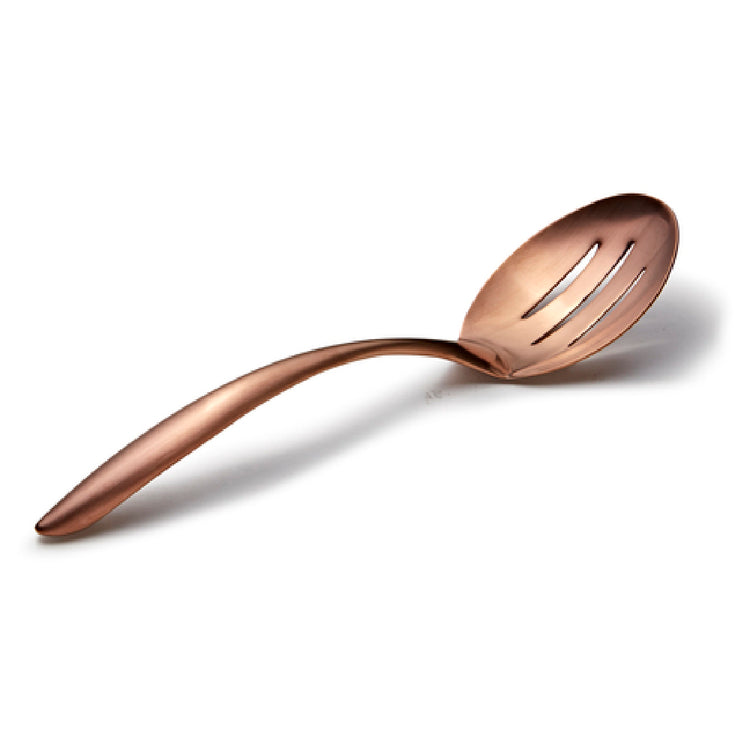 The Bon Chef 9464RGM EZ Use Banquet Serving Spoon is a meticulously crafted utensil designed for professional culinary environments. Measuring 9-3/4 inches, this serving spoon is engineered for precision and efficiency, making it an ideal choice for banquet settings. With a capacity of 1 oz., it provides accurate portion control, essential for maintaining consistency in large-scale food service operations. The spoon features a slotted design, which is particularly effective for serving dishes that require draining excess liquid. Constructed from 18/8 stainless steel, it ensures durability and resistance to corrosion, perfect for the demanding conditions of commercial kitchens. The PVD coating in a rose gold hue not only adds a touch of elegance but also enhances the utensil's durability and scratch resistance. Its matte finish provides a sophisticated aesthetic that complements a variety of table settings. The hollow cool handle is designed for comfort, reducing heat transfer and ensuring a secure grip even during prolonged use. This serving spoon is a versatile tool, suitable for caterers, buffet services, and high-end dining establishments seeking both functionality and style in their serving utensils.