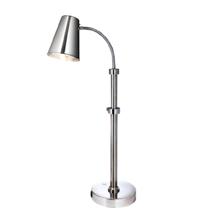 The Bon Chef 9669-T Single Heat Lamp is a precision-engineered heating solution, measuring 9 inches in length, 9 inches in width, and 27 inches in height, designed to meet diverse industry needs. It features a robust 250-watt bulb, ideal for maintaining optimal food temperatures in various settings. The lamp is portable, countertop, and freestanding, offering flexible placement options to suit different operational environments. Its adjustable flexible neck allows for precise heat focus, enhancing its utility in both professional kitchens and catering events. Constructed from stainless steel with a mirror finish, this heat lamp combines durability with an attractive aesthetic. Operating at 110 volts with a single-phase 60 Hz power supply, it draws 2.2 amps of current. The 5-foot cord with a NEMA 5-15P plug is daisy chain capable, expanding its usability in interconnected setups. This product's technical and functional elements make it a valuable asset across various market segments, from high-volume restaurants needing efficient serveware solutions to boutique catering services seeking elegant and reliable heating equipment. Its distinctive blend of portability, adjustability, and stainless steel construction ensures it meets the rigorous demands of the hospitality industry while maintaining a stylish appearance.