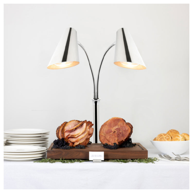 The Bon Chef 9670-CB-BW Carving Board is a substantial and expertly designed kitchen accessory measuring 30 inches by 21 inches, with a height of 2 inches, making it an ideal choice for culinary professionals and home chefs alike. Crafted from premium Black Walnut, this rectangular carving board offers durability and an aesthetically pleasing appearance that complements any kitchen decor. A standout feature of this board is its cutout designed specifically to accommodate Double Round 9670 or 9656 Heat Lamps, providing a seamless integration for establishments that employ these heat lamps for maintaining food temperature during service. Further enhancing its functionality, the board includes a drip channel to effectively manage and contain any juices or liquids from carved meats, ensuring a clean and efficient workspace. To prevent movement during use, rubber stoppers are installed on the base, offering stability and safety by securing the board in place on various countertop surfaces. The Bon Chef 9670-CB-BW Carving Board combines functional design with premium materials, making it a versatile tool for restaurants, catering services, and home enthusiasts who value precision and quality in their food preparation and presentation endeavors.