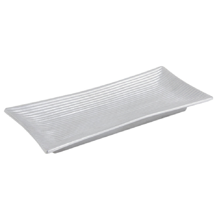 The Bon Chef 9921 Platter 6-1/2" x 14" Footed is a meticulously designed serving solution that seamlessly combines elegance with functionality. This platter measures 6-1/2 inches by 14 inches, making it an ideal size for presenting a variety of dishes in a sophisticated manner. The footed design elevates the platter, adding an element of style while also facilitating easy handling and improved stability on dining tables, buffet setups, or display counters. The ribbed texture of the platter not only enhances its aesthetic appeal but also provides a tactile grip, ensuring that the items placed on it remain secure during service. Finished in Pewter-Glo, this platter exudes a classic yet contemporary charm, making it a versatile choice for upscale restaurants, catering services, and hospitality venues looking to impress their guests with refined presentation. The unique value of the Bon Chef 9921 Platter lies in its combination of size, functional design, and distinctive finish, catering to the needs of various market segments within the food service industry. Whether used for serving appetizers, main courses, or desserts, this platter provides a reliable and stylish solution that aligns with professional standards and enhances the dining experience.