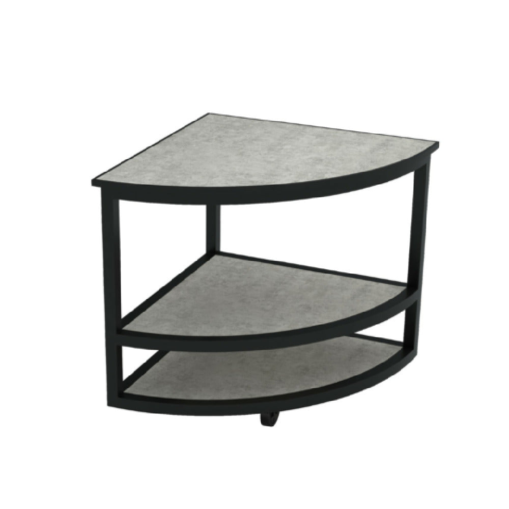 The Bon Chef NX-1-CR-B-C Nexus Corner Round Side Table is a versatile and functional piece designed for various professional settings. Measuring 31.5 inches by 31.5 inches by 33.5 inches, this table features a unique corner round design that maximizes space utilization. It comes with three exposed shelves, providing ample storage and display options for a wide range of purposes. The table's exterior is constructed with a concrete laminate finish, offering a modern and industrial aesthetic that complements its robust functionality. The edges are reinforced with black aluminum, enhancing durability and adding a sleek contrast to the overall design. This combination of materials ensures that the table is not only stylish but also built to withstand the demands of high-traffic environments. The Bon Chef NX-1-CR-B-C is particularly suited for sectors such as hospitality, retail, and corporate spaces where both aesthetics and practicality are paramount. Its design allows it to seamlessly integrate into corners, optimizing space while offering easy access to stored items. This side table exemplifies a blend of form and function, making it an essential addition to any setting that values efficient space management and contemporary design.