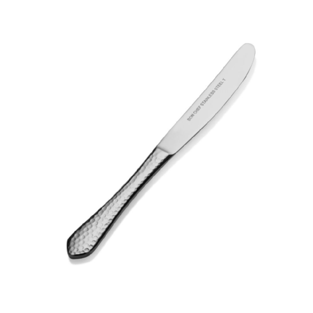 The Bon Chef S1217 Reflections European Butter Knife - solid handle - 6.93" is a meticulously crafted utensil designed to bring elegance and functionality to any dining experience. This butter knife is constructed from high-quality 13/0 stainless steel, ensuring durability and resistance to corrosion, which is particularly beneficial for frequent use within both residential and commercial settings, such as hotels, restaurants, and catering services. The solid handle design not only provides a comfortable grip but also adds a touch of sophistication to the dining table, making it suitable for upscale events and casual gatherings alike. Measuring 6.93 inches, the butter knife offers the perfect length for ease of use, allowing for smooth and effortless spreading of butter or other condiments. Its robust construction and elegant design make the Bon Chef S1217 a preferred choice for those seeking a blend of style and practicality. Whether enhancing the dining experience in a fine dining restaurant or elevating a home dinner setting, this knife stands out as a versatile and reliable accessory. Its refined appearance complements any cutlery set, providing an understated yet impactful addition to any table setting.