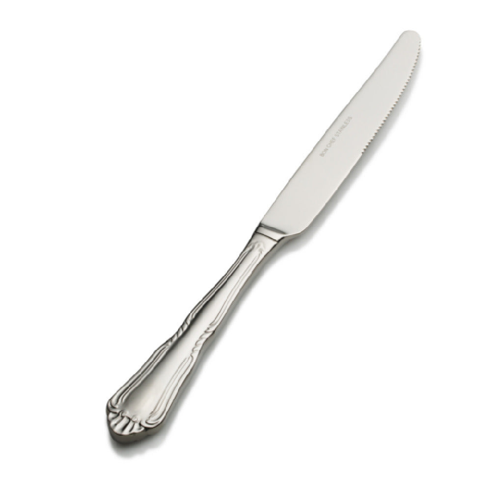 The Bon Chef S1512 Sorento European Dinner Knife stands out as a distinctive piece of cutlery, crafted with precision to meet the demands of fine dining establishments. Measuring 9.79 inches in length, this knife is designed with a solid handle, providing a balanced and comfortable grip ideal for both casual and formal dining settings. It is constructed from 13/0 stainless steel, a material known for its durability and resistance to rust, making it a practical choice for high-volume restaurants and catering services. The knife's elegant European style is suitable for a variety of dining experiences, from upscale restaurants to luxurious hotel banquets, adding an air of sophistication to any table setting. The Bon Chef S1512 Sorento knife is particularly well-suited for those in the hospitality industry who value the combination of aesthetic appeal and functional design. Its robust construction also ensures longevity and ease of maintenance, key features that support efficient kitchen operations. This knife seamlessly integrates into any tableware collection, enhancing the dining experience with its sleek and professional appearance.