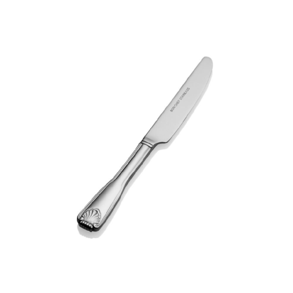 The Bon Chef S2017 Shell European Butter Knife is a meticulously crafted utensil, designed to offer both elegance and functionality to fine dining establishments. Measuring 7 inches in length, this butter knife features a solid handle that provides a comfortable and balanced grip for users. It is made from 13/0 stainless steel, which not only ensures durability and resistance to corrosion but also enhances the utensil's aesthetic appeal with a polished finish. This particular grade of stainless steel is known for its strength and ability to maintain a sharp edge, making it an excellent choice for commercial kitchens and high-end restaurants. The distinctive shell design adds a touch of sophistication, appealing to diverse markets within the culinary industry, from upscale hotels to modern bistros. Its robust construction and elegant design make it a versatile addition to any table setting, providing a seamless blend of style and practicality. The Bon Chef S2017 is not just a tool, but a statement piece that elevates the dining experience, making it an essential component for establishments aiming to deliver an unforgettable service. Its unique combination of features makes it an exemplary choice for those seeking quality and distinction in their cutlery selection.