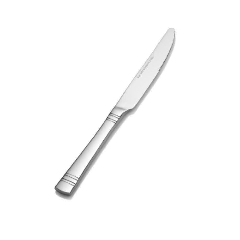 The Bon Chef S2612 Julia European Dinner Knife - solid handle - 9.84" exemplifies precision and elegance in cutlery design, tailored for diverse dining environments. Crafted from 13/0 stainless steel, this knife is engineered to withstand the rigors of frequent use while maintaining its sleek aesthetic appeal. Its solid handle offers a balanced and comfortable grip, enhancing the dining experience for users in both casual and formal settings. Measuring 9.84 inches in length, this European-style dinner knife is perfectly sized for harmonious integration into a variety of table settings, whether in upscale restaurants, banquet facilities, or home dining collections. The choice of 13/0 stainless steel not only provides a corrosion-resistant surface but also ensures a high-polish finish that resists tarnishing over time. This specific grade of stainless steel, known for its magnetic properties, is particularly advantageous for establishments utilizing magnetic retrieval systems for cutlery organization. The Bon Chef S2612 is a strategic addition to any culinary setting that values durability combined with refined design, fulfilling the needs of hospitality businesses aiming to deliver exceptional dining experiences. Its robust construction and timeless style contribute to its standing as a versatile tool in the culinary industry, appealing to both commercial and residential markets.